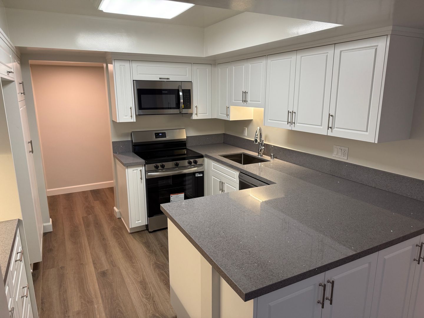 Gated building with elevator access, fully renovated unit that features fresh paint, new kitchen cabinets and quartz counter tops, Stainless Steel stove and D/W, microwave, Central A/C and Heat paid for by owners , wood laminate floors, new carpet in bedrooms only, remodeled bathrooms, balcony, 2 subterranean parking spaces, on-site laundry room.